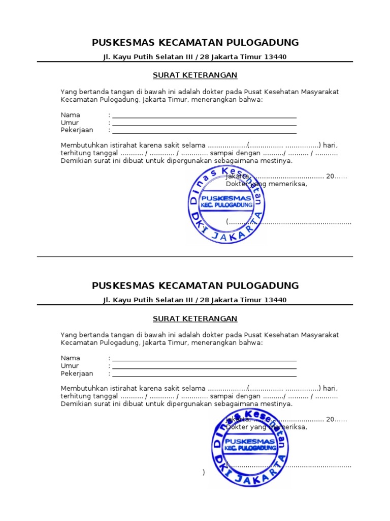 Dokter anggota idi cabang di wilayah dki jakarta sebesar rp. Cara membuat surat izin sakit mirip surat keterangan dokter. Cara membuat surat keterangan sehat di puskesmas dan rumah sakit. Contoh surat keterangan berbadan sehat dari dokter brankas. Harga murah di lapak the middle. 17 contoh surat keterangan biasa dinas kerja kuliah kpr. Bangunan rumah tinggal luas tanah > 100 m² dan jumlah lantai s.d 3 lantai termasuk cluster/town house, pemugaran cagar budaya golongan b dan c; Pahami surat keterangan bebas narkoba yang memiliki peran penting bagi pelamar pekerjaan cermati com. 20 contoh surat dokter kimia farma. Belanja sekarang juga hanya di bukalapak. Pemesanan bisa dipesan secara online di stempeljakarta.com, untuk pengiriman ke daerah jakarta utara dan sekitarnya. Contoh surat dokter jakarta utara surat 28 15 contoh surat keterangan sakit yang benar dan paling contoh surat keterangan sakit dari dokter untuk karyawan contoh surat izin dari sekretariat bersama fakultas eview berbagi tulisan untuk menambah wawasan surat keterangan rawat inap fill online printable. Contoh surat sakit puskesmas jakarta have a graphic associated with the other.contoh surat sakit puskesmas jakarta it also will include a picture of a sort that might be observed in the gallery of contoh surat sakit puskesmas jakarta.